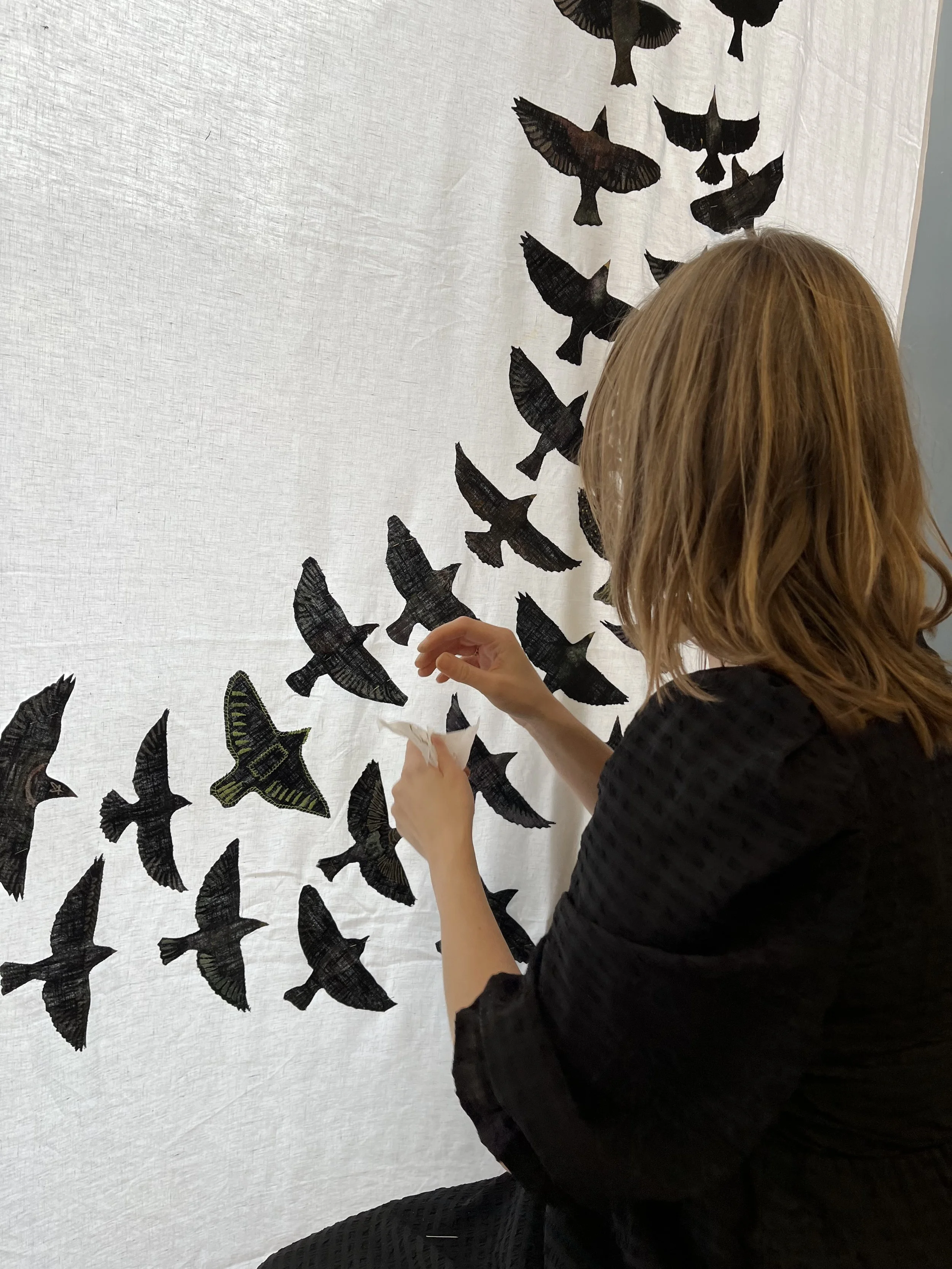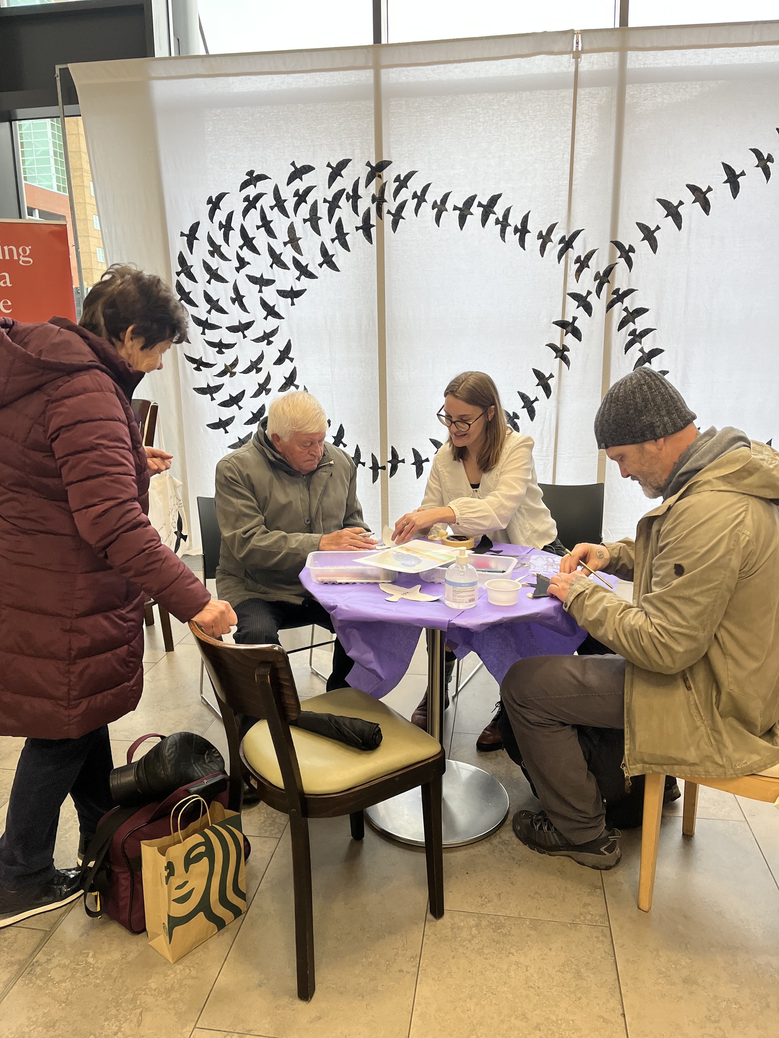 The station was turned into a location where people would stay to engage in art and performance, giving a chance to find an audience for the new app and talk to them about their experience with it. The lobby of Lanyon Place was transformed during the half term break, a time when it was busy with commuters and tourists. Travellers enjoyed sitting down to make their own starlings and trying out the AR app on the iPad. The creation of the Infinity linen mural of starlings added a beautiful piece of participatory art to the world. Watching it change over the week as birds were added each day was magical, and meant the station looked a little bit different each day. The evening performances filled the station with music, and audiences came to see the acts and stopped on their way through, taking a few minutes to listen.